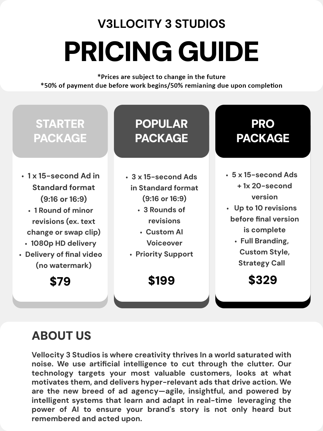 Vellocity 3 Studios is where creativity thrives In a world saturated with noise. We use artificial intelligence to cut through the clutter. Our technology targets your most valuable customers, looks at what motivates them, and delivers hyper-relevant ads that drive action. We are the new breed of ad agency—agile, insightful, and powered by intelligent systems that learn and adapt in real-time leveraging the power of AI to ensure your brand's story is not only heard but remembered and acted upon.